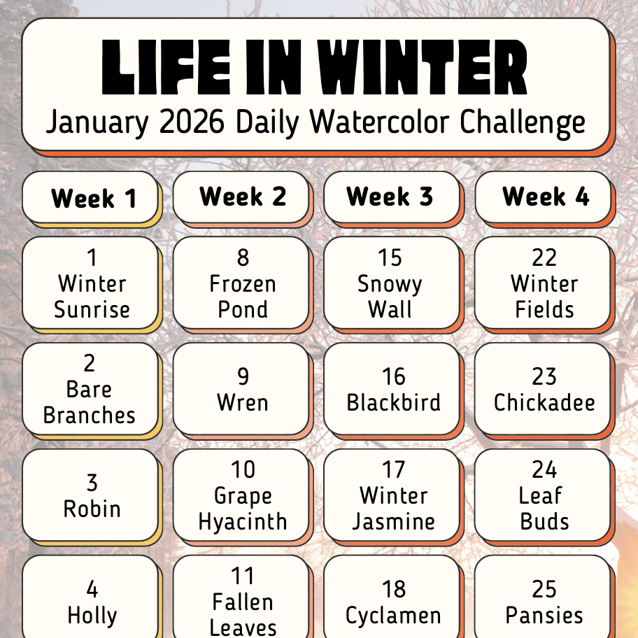 This month’s prompt sheet contains ideas designed to help you to create four compositions which will depict January as we go through the month week by week, so if you choose to you can combine all of the elements from each week into one painting. Alternatively you can use the prompts for a daily painting in the traditional way.
