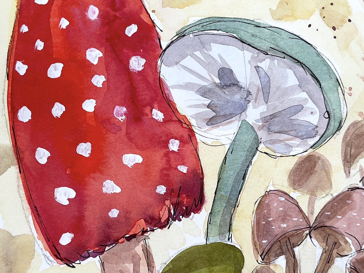 This beautiful mushroom forest painting is beginner-friendly, as well as being a challenge for more advanced artists. It’s easy to make the design different by painting only one or two of the mushrooms, and making the whole picture bigger or smaller depending on whether you want a full size painting or a greetings card! It might look a little complicated but in this video I show you how to draw a mushroom and then we will work through the painting step by step to make the whole thing easy to complete.